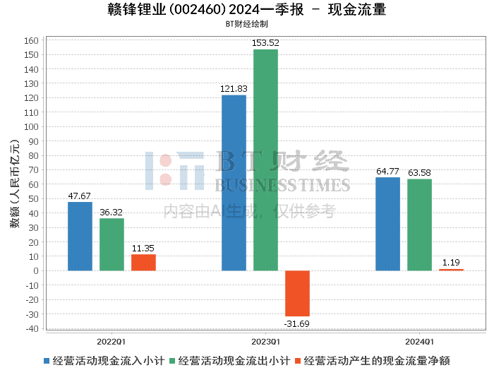 现金流量方面,赣锋锂业在2024年一季度的表现有所改善。经营活动产生的现金流量净额为1.19亿元,而上年同期为-31.69亿元,增幅达103.75%。这一改善主要是由于本期购买商品、接受劳务支付的现金和缴纳相关税费减少所致。然而,筹资活动产生的现金流量净额为15.74亿元,同比下降65.64%,主要原因是本期取得借款收到的现金减少及偿还债务支付的现金增加。