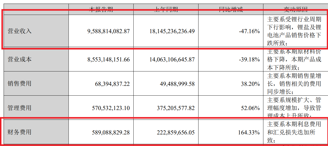 赣锋锂业在半年报中指出,营业收入下降主要系受锂行业周期下行影响,锂盐及锂电池产品销售价格下跌所致。其次,财报数据显示,公司的财务费用高达5.89亿人民币,相比去年暴增了1.6倍。