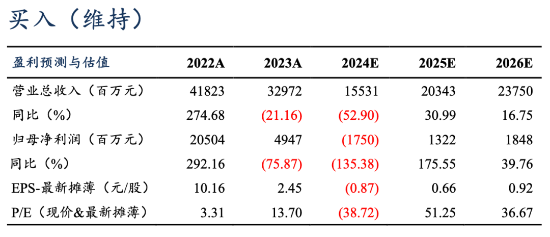 盈利预测与投资评级:由于24年公司业绩受到PLS股价下跌、存货减值等影响,我们下调2024年盈利预测,考虑25-26年锂价中枢有望上移,我们上调2025-2026年盈利预测,我们预计2024-2026年公司归母净利润-17.5/13.2/18.5亿元(原预期24-26年为-6.2/12.3/18.0亿元),同比-135%/+176%/+40%,对应25-26年51x/37xPE,由于公司全球布局众多优质锂资源,矿端自供率持续提升,维持“买入”评级。