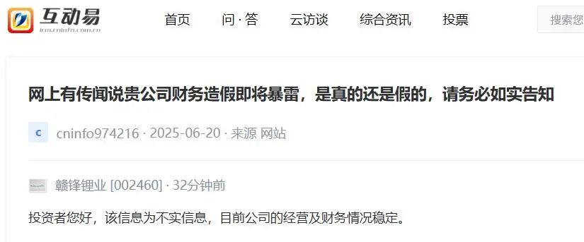7月3日在互动平台就“网传公司财务造假即将爆雷”的问题回复称:“该信息为不实信息,目前公司的经营及财务情况稳定”。