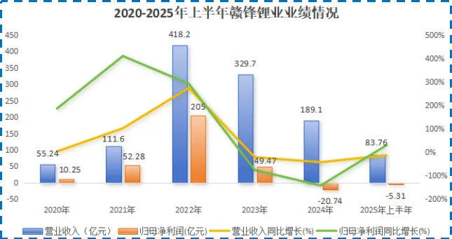 然而,2024年赣锋锂业遭遇上市以来首次年度亏损,金额达20.74亿元。2025年上半年,公司净亏损仍有5.31亿元。