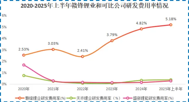 自2020年以来,赣锋锂业共砸下约46.5亿元用于研发,其研发费用率也攀升至2025年上半年的5.18%,远高于天齐锂业、盛新锂能等同行。