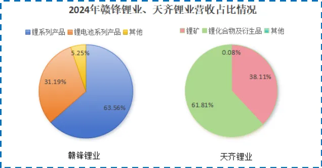 2024年,天齐锂业和赣锋锂业的主营产品都是锂化合物,营收占比约为六成。此外,天齐锂业还有三成营收由锂矿构成,而赣锋锂业选择了锂电池。