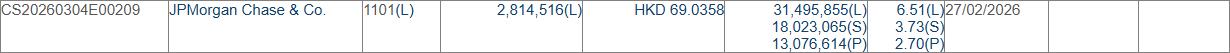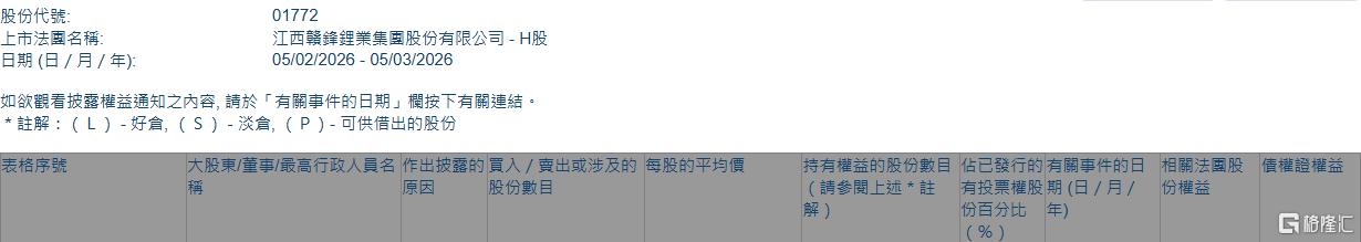 格隆汇3月5日丨根据联交所最新权益披露资料显示,2026年2月27日,赣锋锂业(01772.HK)获JPMorgan Chase & Co.以每股均价69.0358港元增持好仓281.45万股,涉资约1.94亿港元。