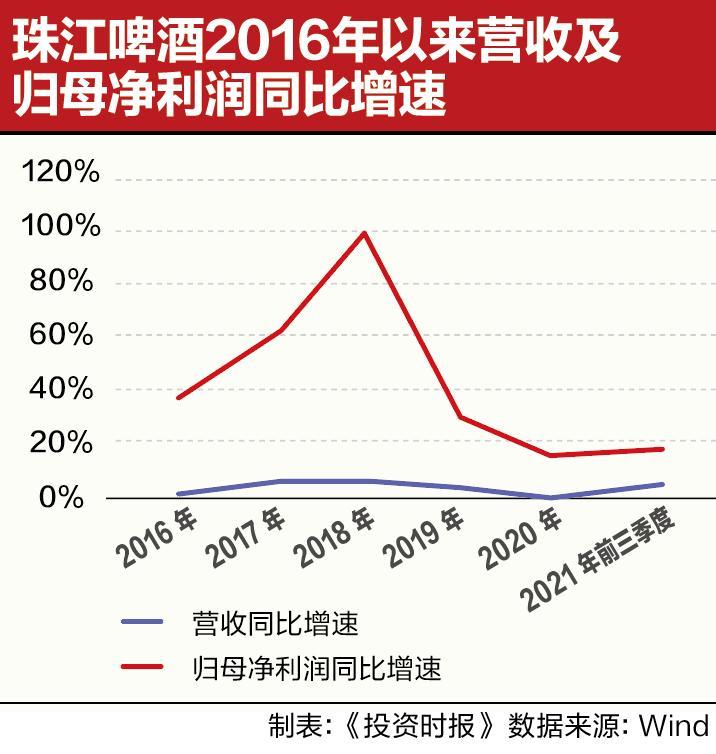 而在此背后,近年来珠江啤酒业绩呈现疲软态势。2018年至2019年,公司营收同比增速仅为个位数,2020年增速不足1%。上述三年,归母净利润虽有“双位数”增幅,但同比增速由97.68%下落至14.43%,盈利能力趋弱。