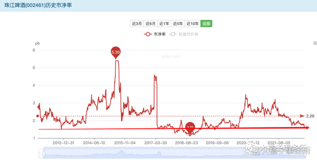 实际 pb 净资产走势:极限情况会被打到 1 pb 附近,整体来看基本 1.5 pb 就是珠江的大底部。现在每股净资产 4.2,那么 6.3 可以做为一个底价参考。上限 3 倍附近,对应 12.6。平均 2.3,对应 9.6。