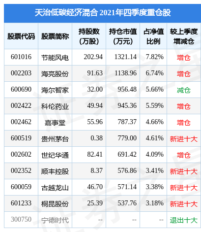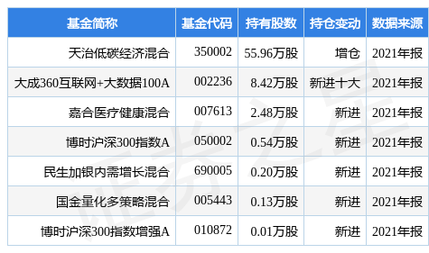 根据2021年报基金重仓股数据,重仓该股的基金共7家,其中持有数量最多的基金为天治低碳经济混合。天治低碳经济混合目前规模为1.69亿元,最新净值0.9809(3月22日),较上一日下跌0.15%,近一年上涨7.23%。该基金现任基金经理为许家涵。许家涵在任的公募基金包括:天治核心成长混合(LOF),管理时间为2015年6月2日至今,期间收益率为-24.09%;天治财富增长混合,管理时间为2019年7月23日至今,期间收益率为28.37%;天治稳健双盈债券,管理时间为2022年1月18日至今,期间收益率为-1.57%。