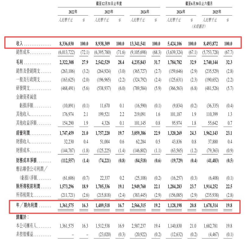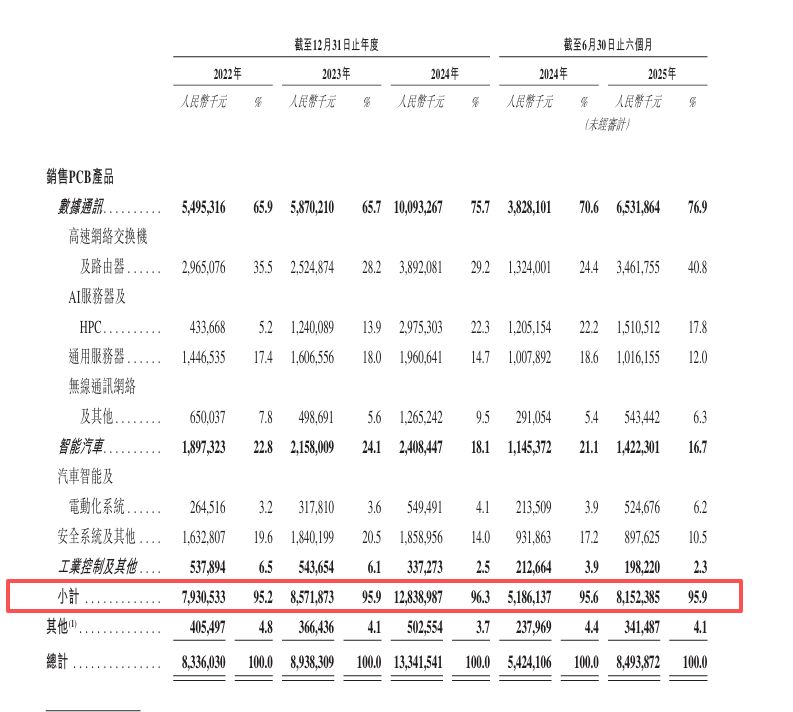 2022年、2023年、2024年和2025年上半年(下称“报告期内”), 沪电股份 的绝大部分收入均来自PCB产品销售,期间该业务收入占比分别为95.2%、95.9%、96.3%和95.9%。