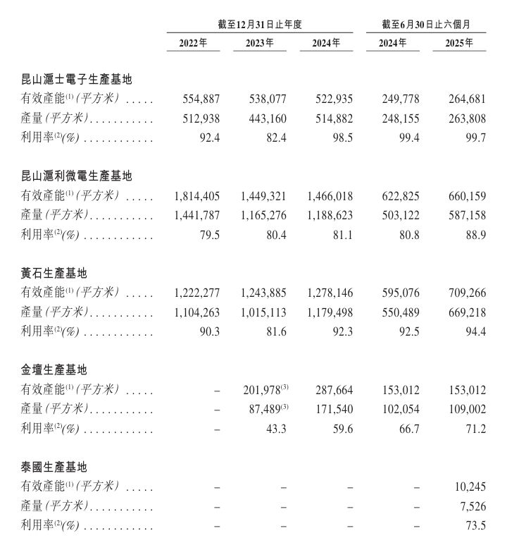 不过,从招股书披露的五大生产基地产能利用率来看,除昆山沪士电子生产基地和黄石基地的产能利用率在2025年上半年基本饱和外,其余生产基地的利用率均不及90%。
