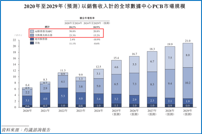 行业数据显示,2024-2029年全球AI服务器PCB市场规模复合年增长率预计高达20.8%,明显比交换机及路由器PCB的市场增速快得多。
