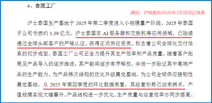 更值得一提的是,沪电股份海外泰国工厂产能也正逐步释放。尽管2025年该工厂亏损1.39亿元,但2025年第四季度环比数据显示,其经营形势已迎来拐点。