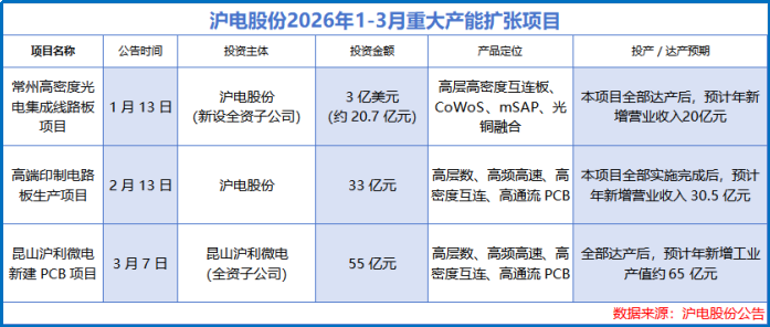 事实上,沪电股份此前已有布局,2024年10月便将暂停的募投项目变更为43亿元的人工智能芯片配套高端PCB扩产项目,预计2026年下半年试产并逐步释放产能。