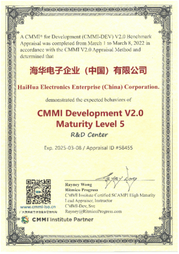 2022年3月,CMMI5专家评估组对海华电子软件研发体系和管理实践进行了全实践域的严格审查,访谈考评了企业各职能部门和业务角色对CMMI5体系的理解和实践水平,认定企业具备了自主量化改进的组织能力,通过现场评估。2022年4月,海华电子正式获得CMMI5级认证。