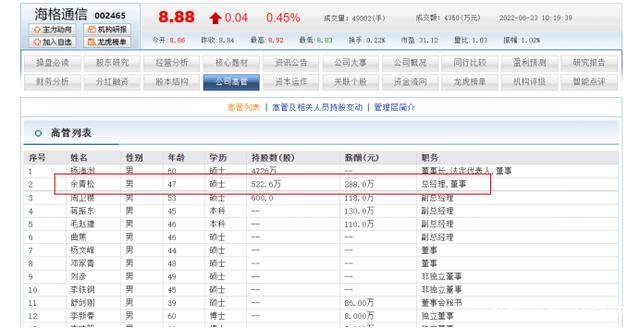 余青松目前持有公司股份522.6万股,2021年从公司获得288万薪酬。