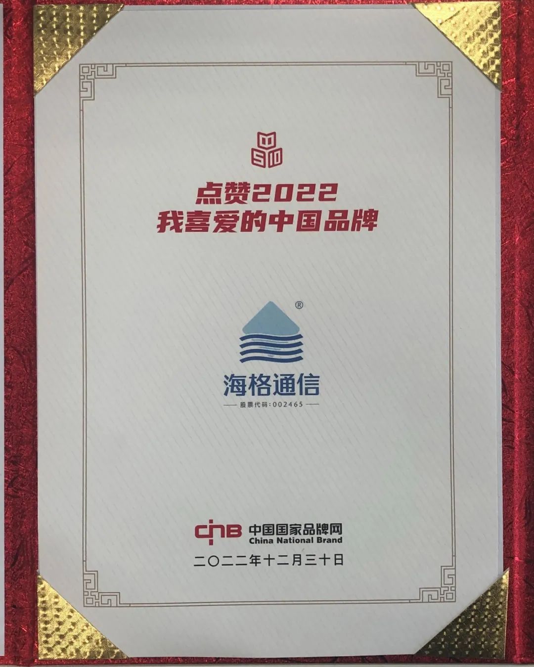 近日,由中国国家品牌网联合新华社及相关机构共同举办的“点赞2022我喜爱的中国品牌”活动圆满结束,正式发布排名前100名入围品牌并颁发证书。海格通信(SZ 002465)上榜“点赞2022我喜爱的中国品牌”。