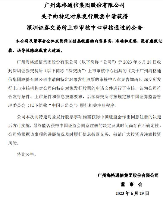 中国经济网北京6月29日讯海格通信(002465.SZ)昨晚发布《关于向特定对象发行股票申请获得深圳证券交易所上市审核中心审核通过的公告》称,公司于2023年6月28日收到深交所上市审核中心出具的告知函,深交所发行上市审核机构对公司向特定对象发行股票的申请文件进行了审核,认为公司符合发行条件、上市条件和信息披露要求,后续深交所将按规定报中国证监会履行相关注册程序。公司本次向特定对象发行股票事项尚需获得中国证监会作出同意注册的决定后方可实施,最终能否获得中国证监会同意注册的决定及其时间尚存在不确定性。公司将根据该事项的进展情况及时履行信息披露义务。