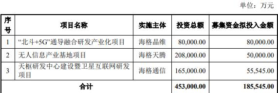 本次向特定对象发行股票募集资金总额不超过185545万元(含本数),扣除发行费用后,募集资金净额将用于“北斗+5G”通导融合研发产业化项目、无人信息产业基地项目、天枢研发中心建设暨卫星互联网研发项目。