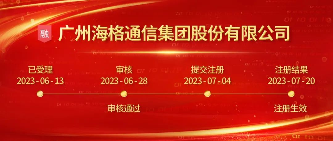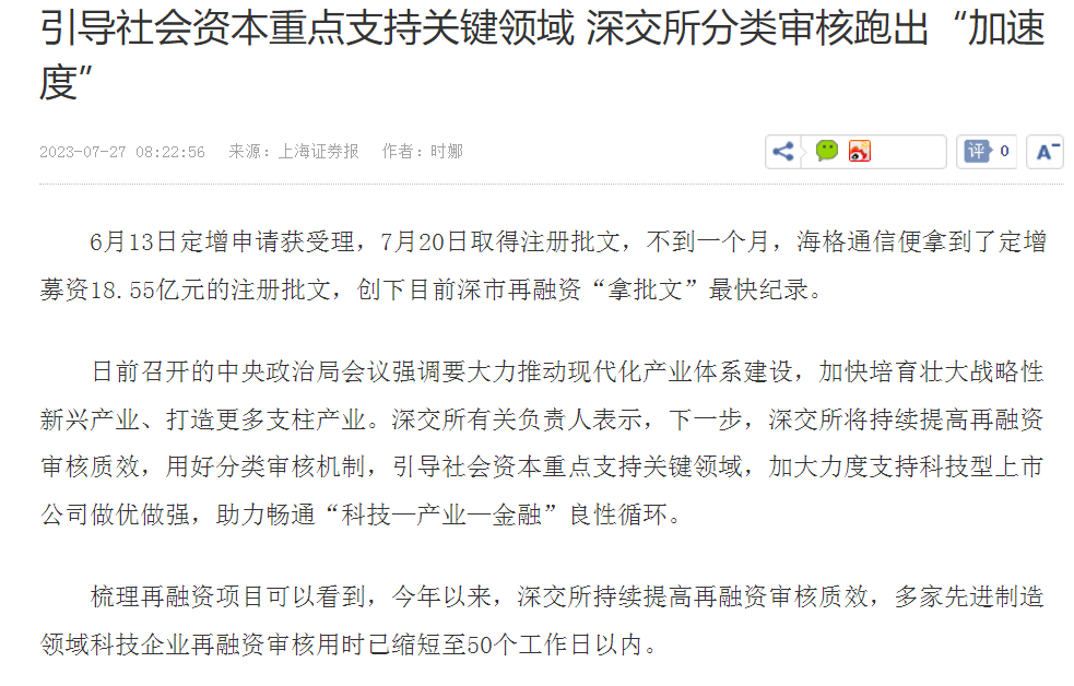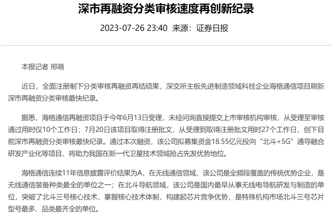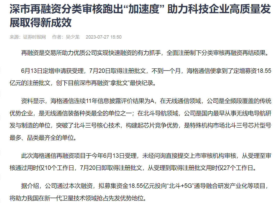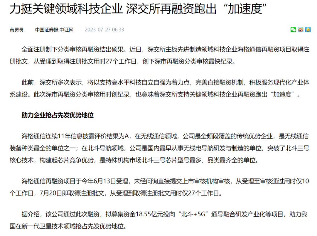 2023年7月20日,海格通信(SZ 002465)再融资项目取得注册批文,从受理到取得注册批文用时仅27个工作日,创下目前深市再融资分类审核最快纪录。