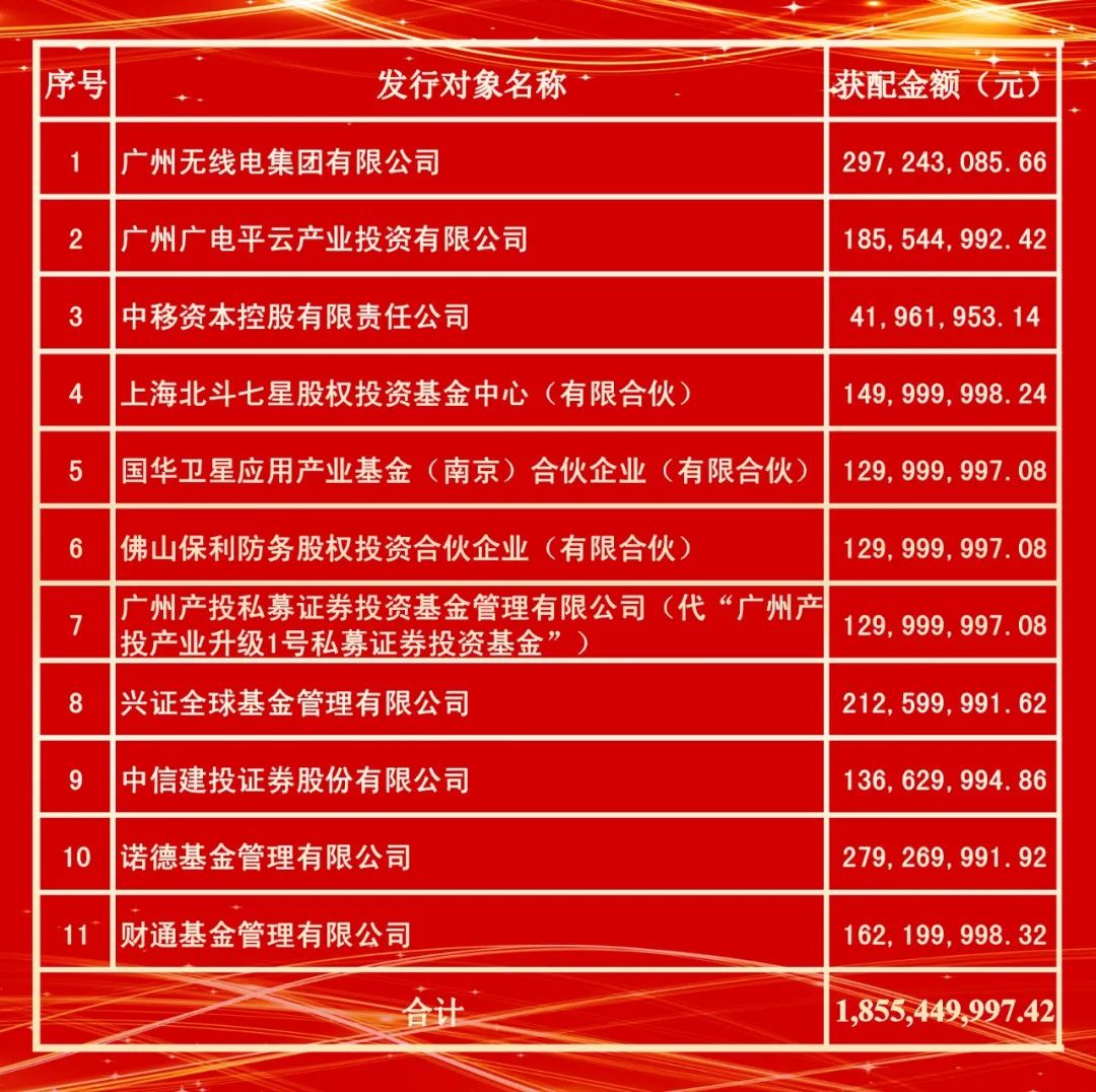 根据发行结果,海格通信本次向特定对象发行股票最终发行价格为10.46元/股,发行数量为177,385,277股,募资总额为1,855,449,997.42元。