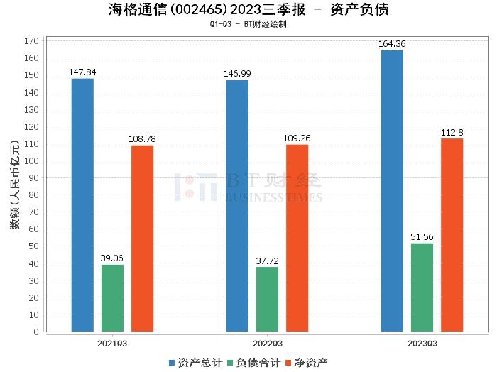 从资产负债方面来看,海格通信2023年三季度的资产总计为164.36亿元,相比上年度末的152.08亿元有所增长。负债合计在本报告期末为51.56亿元,较上年度末的39.45亿元有所上升。公司的净资产在本报告期末为112.8亿元,与上年度末的112.63亿元相比略有增长。资产负债率在本报告期末为31.37%,较上年度末的25.94%有所上升。