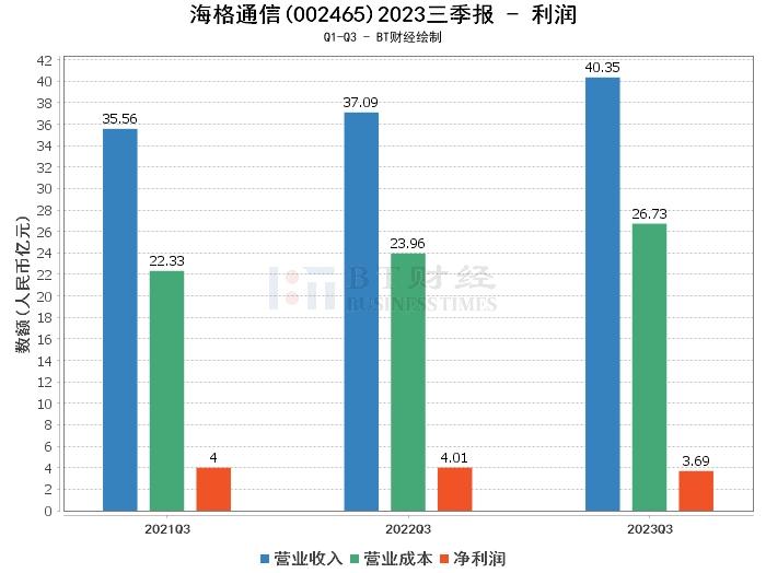 在利润方面,海格通信2023年三季度的营业收入为40.35亿元,相比上年同期的37.09亿元有所增长。营业利润在年初至本报告期末为3.75亿元,较上年同期的4.25亿元有所下降。净利润在年初至本报告期末为3.69亿元,相比上年同期的4.01亿元略有下降。