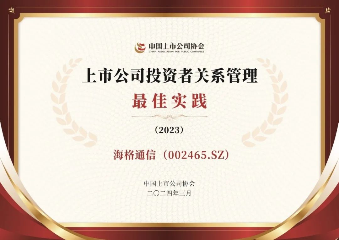日前,中国上市公司协会发布首届“上市公司投资者关系管理最佳实践”榜单,海格通信(SZ 002465)成功入选该项荣誉榜单,充分体现了中国上市公司协会对公司长期以来在投资者关系管理方面所作出努力的高度认可和肯定。