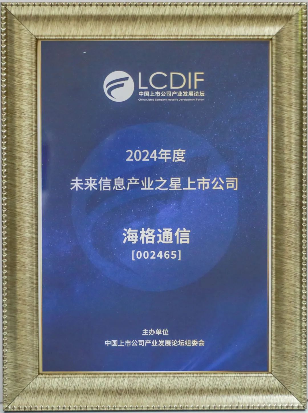 2024年6月21-22日,由合肥市人民政府指导、华民投主办、国元证券和天风证券分别联合主办和协办的第二届中国上市公司产业发展论坛在合肥举行。论坛发布“未来产业之星”上市公司榜单,海格通信(SZ 002465)凭借超前的战略眼光和清晰的产业定位,荣获“2024年度未来信息产业之星上市公司”荣誉。