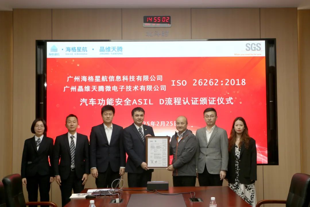 SGS中国区副总裁赵晖表示,道路车辆功能安全标准在汽车和半导体行业推行十数年,具有国际权威性。它全面规范汽车电子系统功能安全,从安全管理到维护各环节都有详细要求,是汽车系统制造商证明产品可靠的关键。海格星航和晶维天腾通过ISO 26262:2018道路车辆功能安全ASIL D流程认证,标志着已建立起符合功能安全最高等级“ASIL D”级别的产品开发和管理流程体系。
