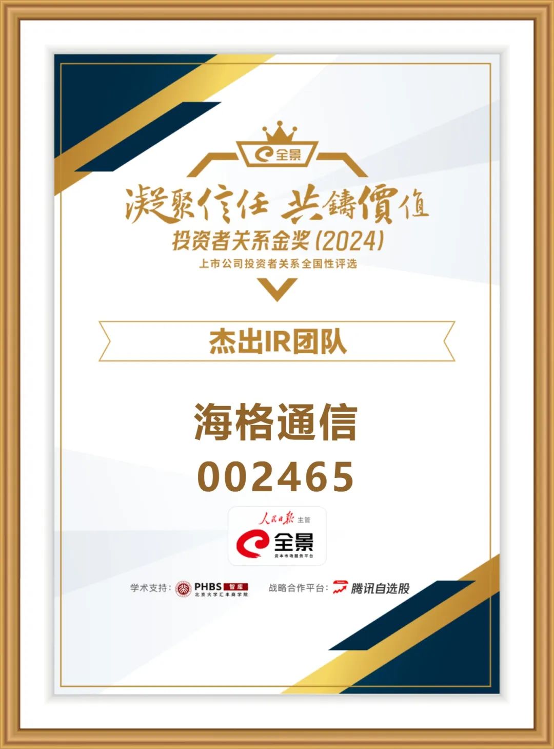 本次获评“全景投资者关系金奖(2024)”荣誉,体现了资本市场对海格通信长期以来在规范治理、价值回报、信息披露、投资者关系管理等方面所取得成果的高度认可和肯定。未来,公司将继续对标高标准、高要求,扎实推进规范治理、持续提升投资者关系工作质量、传递公司投资价值,通过高质量发展为股东创造更多价值!