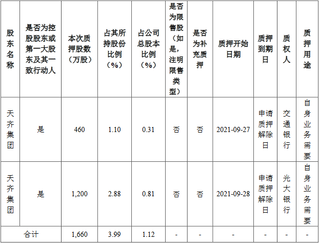 根据公告,天齐集团本次质押用途为自身业务需要,合计质押股份占其所持股份比例3.99%,占公司总股本比例1.12%。