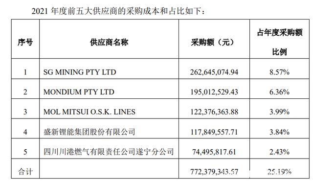 供应商变化:前三为泰利森供应商没有变化,锂精矿委外加工规模增加导致加工商之一盛新锂能加工数量增加,四川川港燃气主要向射洪工厂提供天燃 气能源。