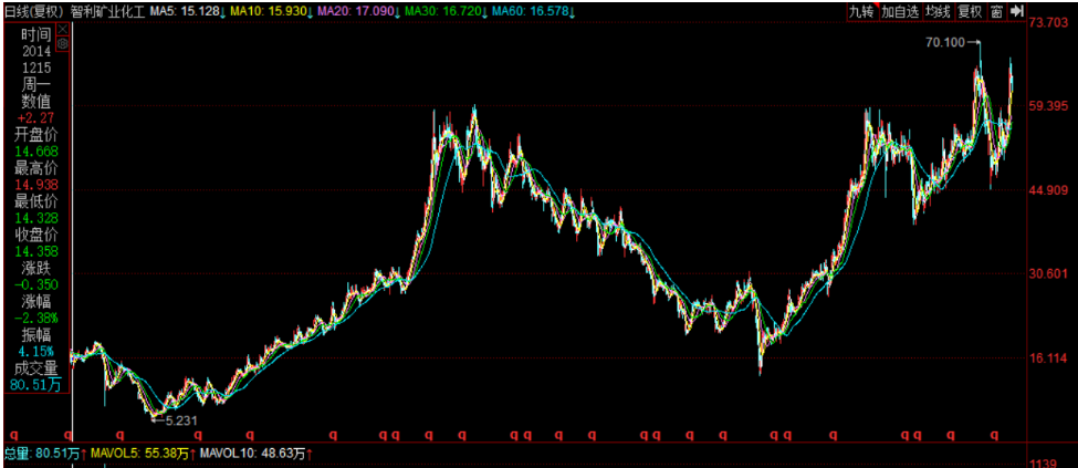 天齐锂业收购泰利森,也让股价坐上了火箭:其上扬的股价甚至穿越过那场惨绝人寰的2015大股灾,从2014年末每股10元、100亿的市值暴增到每股50元、400亿市值。