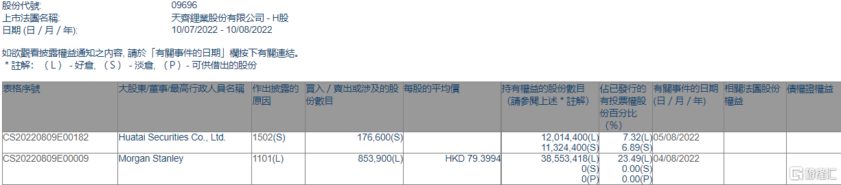 根据联交所最新权益披露资料显示,2022年8月4日,天齐锂业(09696.HK)获Morgan Stanley在场内以每股均价79.3994港元增持好仓85.39万股,涉资约6779.91万港元。
