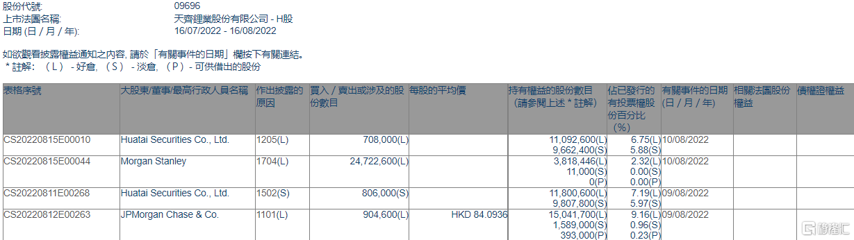 根据联交所最新权益披露资料显示,2022年8月9日,天齐锂业(09696.HK)获JPMorgan Chase & Co.以每股均价84.0936港元增持好仓90.46万股,涉资约7607.107万港元。