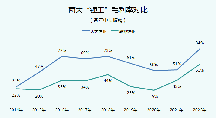 而另一边,另一位“锂王”赣锋锂业的增长率虽然也翻了数倍,但略逊于天齐锂业。