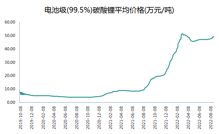 但供给增长的同时,储能市场也迎来爆发,锂盐的需求缺口得以持续存在。财信证券预计,2022年碳酸锂当量(LCE)总供给约为60.2万吨,总需求为64.1万吨,缺口高达3.9万吨。由此造成的供需缺口带动了锂盐产品价格的迅猛上涨,上半年锂均价达45.3万元/吨,同比增长454%。