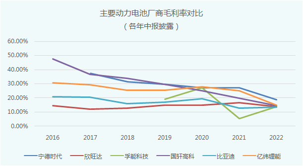 事实上,自我国新能源汽车产业成长以来,电池厂商的毛利率就呈现连年下降趋势(目前已集中至10%-20%区间),与上游原材料连年上涨且高于50%的毛利率形成鲜明对比。
