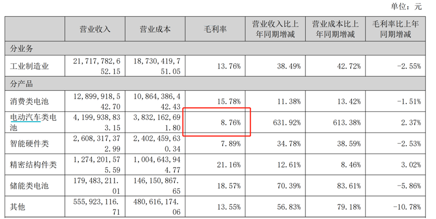 据欣旺达半年报显示,目前欣旺达的支柱产品仍然是消费类电池,营收占比接近60%,而动力电池的营收占比不足20%,且毛利率仅为8.76%。