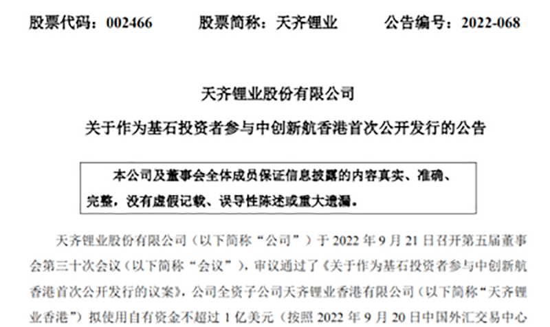 9月21日,天齐锂业董事会通过决议,公司全资子公司天齐锂业香港,拟使用自有资金不超过1亿美元,作为基石投资者参与认购中创新航在港交所IPO的股份,自股份上市之日起锁定6个月。