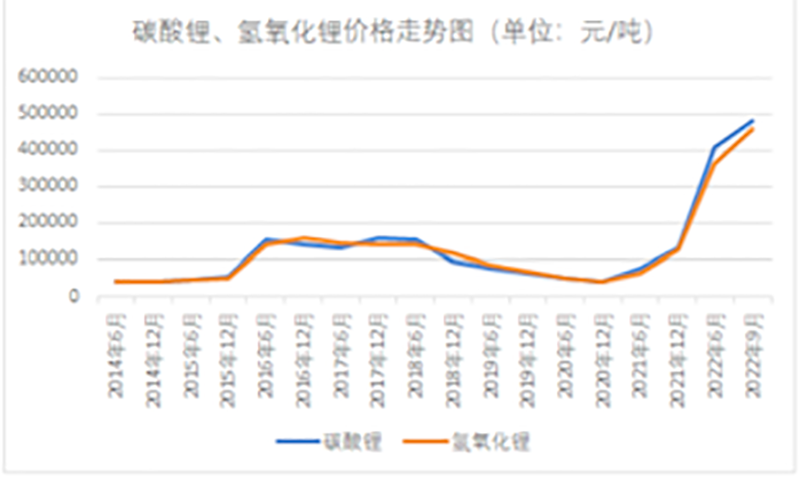 2014年1月至2022年8月,中国国内碳酸锂和氢氧化锂价格走势