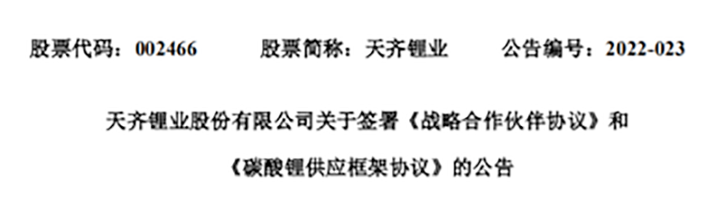 此前,天齐锂业与中创新航已有业务合作。5月9日,天齐锂业与中创新航签署《战略合作伙伴协议》,天齐锂业全资子公司成都天齐与中创新航签署《碳酸锂供应框架协议》。
