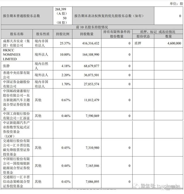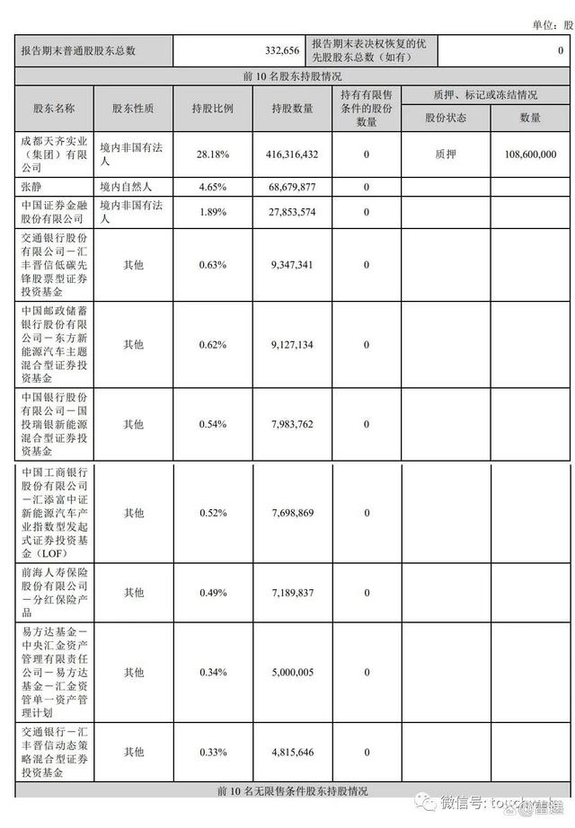 截至2022年9月30日,成都天齐实业(集团)有限公司持股25.37%,HKSCC NOMINEES LIMITED持股10%,张静持股为4.18%,香港中央结算有限公司持股为2.2%,中国证券金融股份有限公司持股为1.7%,中国邮政储蓄银行股份有限公司-东方新能源汽车主题混合型证券投资基金持股为0.67%;