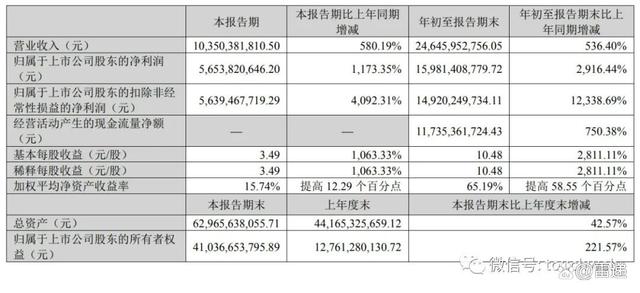 天齐锂业2022年第三季度营收为103.5亿元,同比增长580.19%;净利为56.54亿元,同比增长1173.35%;扣非后净利为56.39亿元。