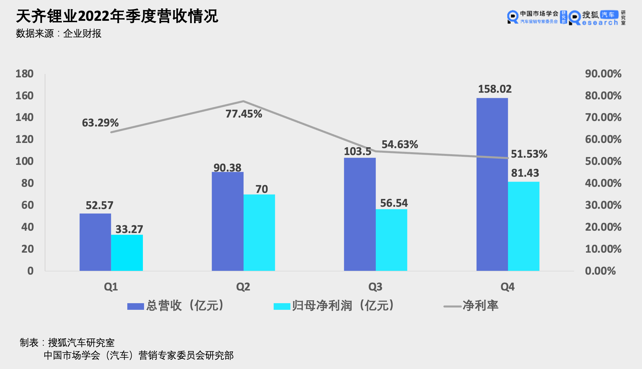 分季度来看,天齐锂业的营收也深度绑定了锂价。2022年,从Q1到Q4天齐锂业的季度营收整体保持大幅增长的趋势。特别是在第三季度之后,单季度的营收甚至突破了百亿元,一度在第三季度超过了宁德时代。这跟锂价的整体走势也基本吻合。