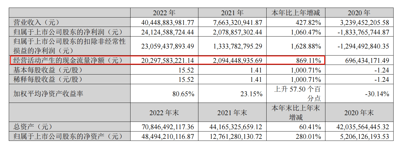 根据年报,2022年天齐锂业经营活动现金流净额为202.98亿元,同比增长了869.11%