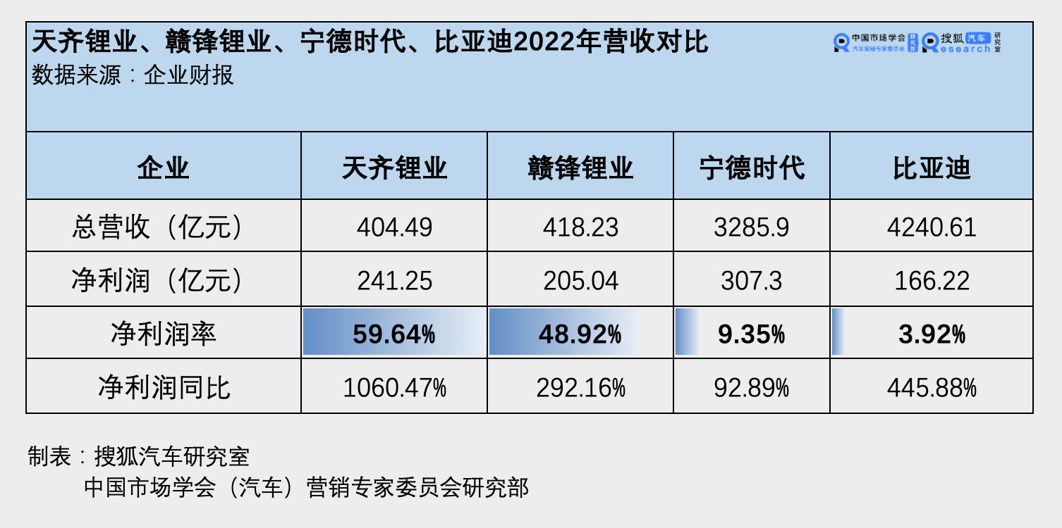 241.25亿的净利润,已经接近宁德时代的0.7倍,比亚迪的1.5倍。和老对手赣锋锂业相比也超出了近40亿元。