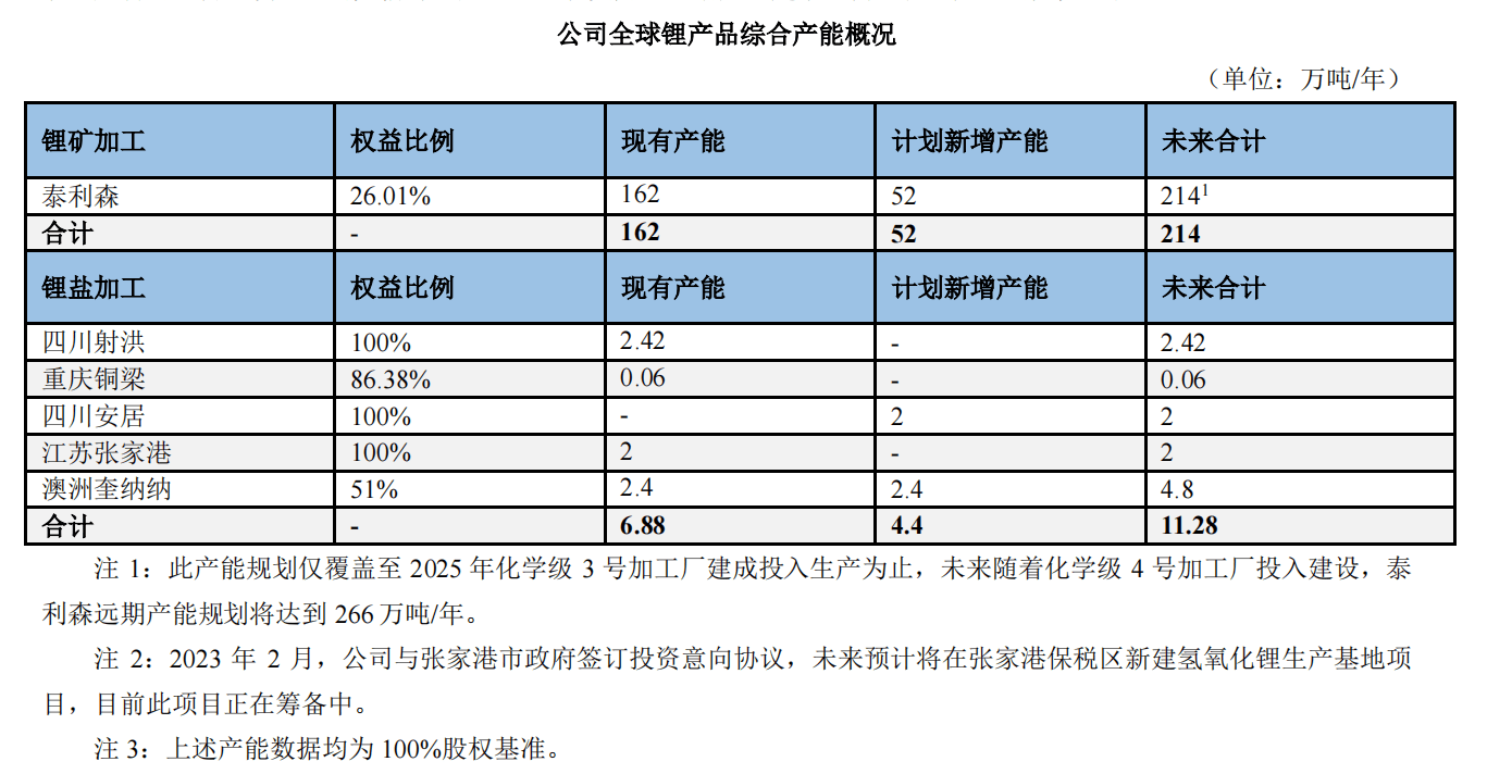 除此之外,今年天齐锂业还将继续扩大产能。根据规划,今年天齐锂业旗下权益占比26.01%的泰利森计划新增产能52万吨;锂盐相关项目新增产能4.4万吨,未来实现11.28万吨/年的产能。