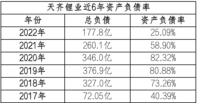 年报中,天齐锂业回顾,在2022年公司通过自有资金及港股 IPO 募集资金等,积极偿还银行贷款,有效降低负债规模。如今,公司已经偿还全部中信银团并购贷款及部分其他金融负债,资产负债率大幅降低,2022年末资产负债率为25.09%,较上年末减少33.81个百分点,全面完成降杠杆目标。