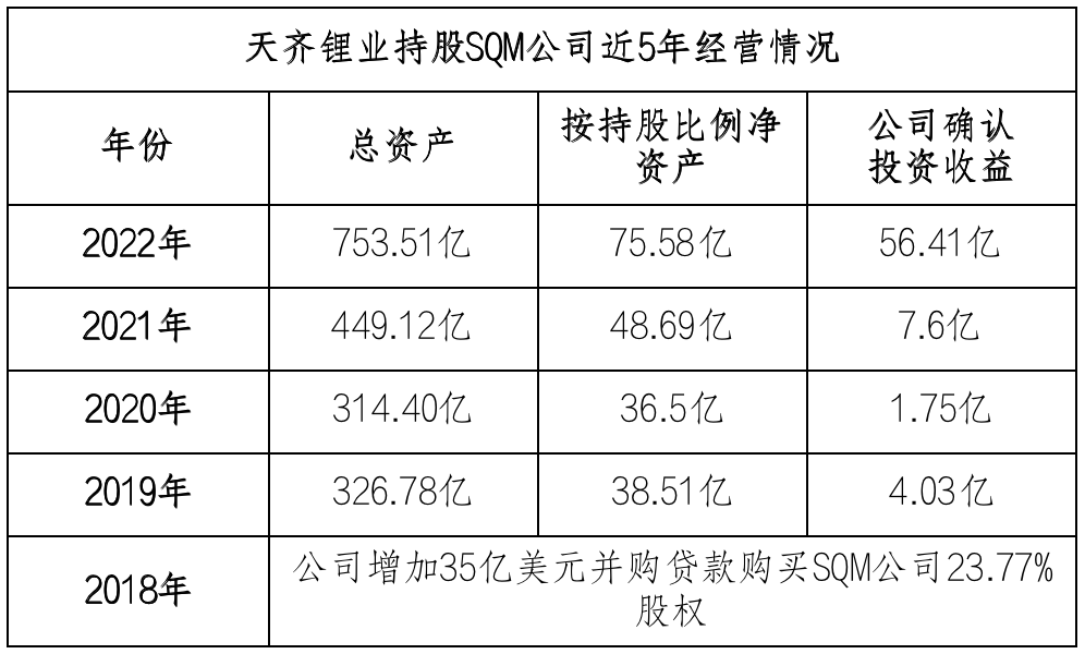 在下游需求旺盛与锂价增长等多重因素促进之下,智利化工矿业公司(以下简称“SQM”),这家天齐锂业当年顶着极大压力投资的公司如今已经成为利润支柱,在去年为公司带来56.41亿元收益。