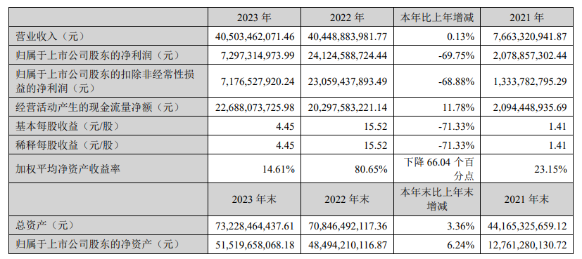 根据年报数据,天齐锂业2023年的营业收入为405亿元,同比微增0.13%。然而,归属于上市公司股东的净利润大幅下降,仅为72.97亿元,较上一年度的241.25亿元减少69.75%。扣除非经常性损益后的净利润也同比下降68.88%。此外,公司基本每股收益和稀释每股收益均从上年的15.52元下降至4.45元,降幅达71.33%。